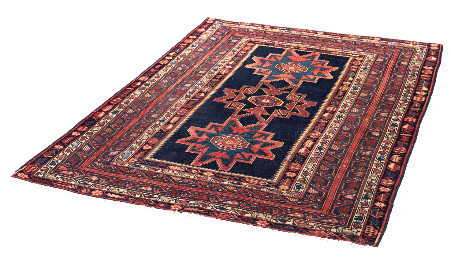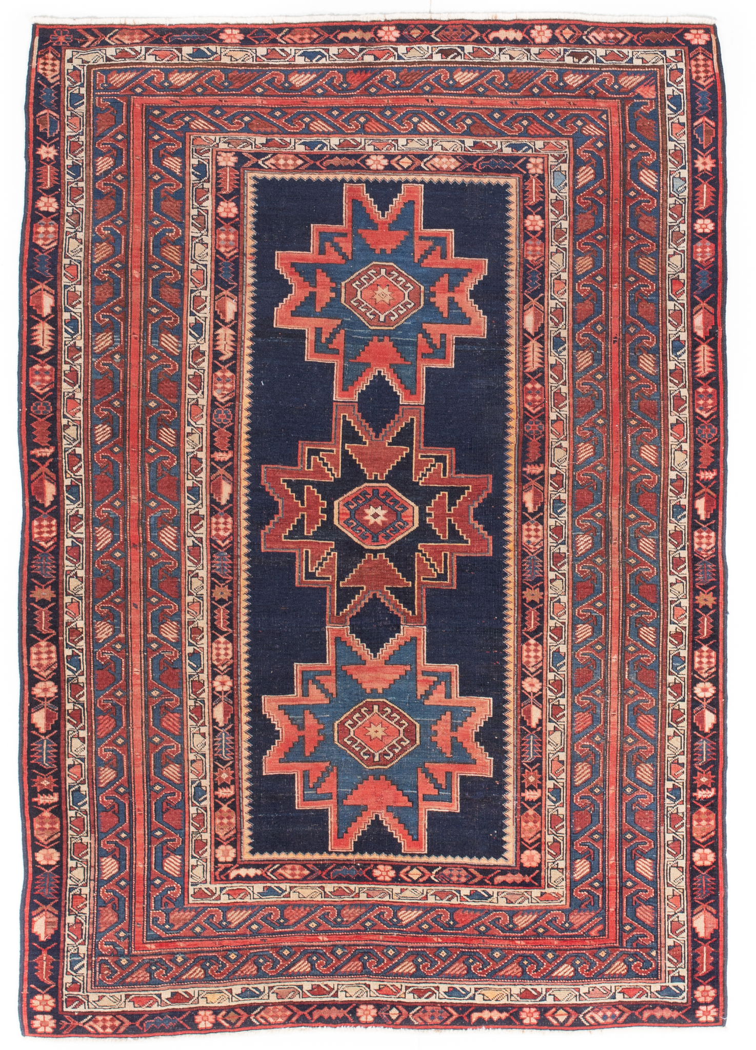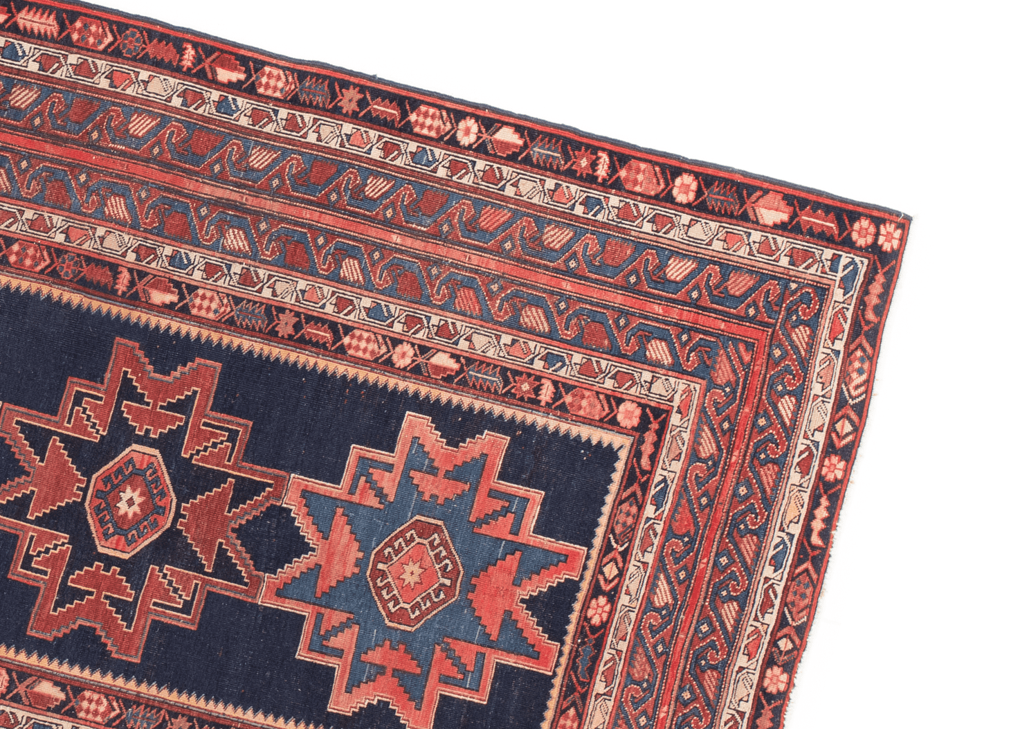This triple star medallion uses the dark open space between the stars to draw in the viewer. The carpet is handcrafted and skilled in earth tones and intricate border detailing. The medallions are dark blue and black stars that are ringed in auras of orange and red.The finery in the inner borders, flower petals, fruits, vines and fanciful geometric designs evoke a standard of detail and color that can only be found in an antique.