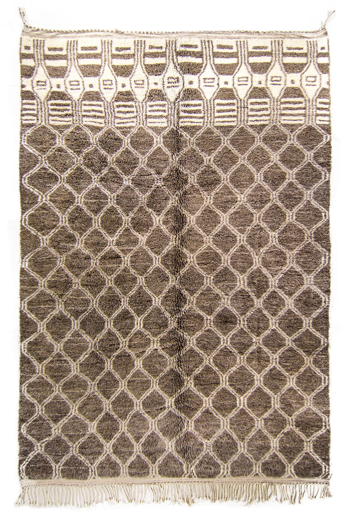 This very fine Beni Ourian uses an earth tone and a detailed network of diamond patterns in white atop the brown. A fine border is often a classical feature of a fine carpet, but this modern Beni showcases only a border on the topmost edge. A narrowing hexagonal pattern in white taking over the diamond grid pattern. A fine addition to any collection.