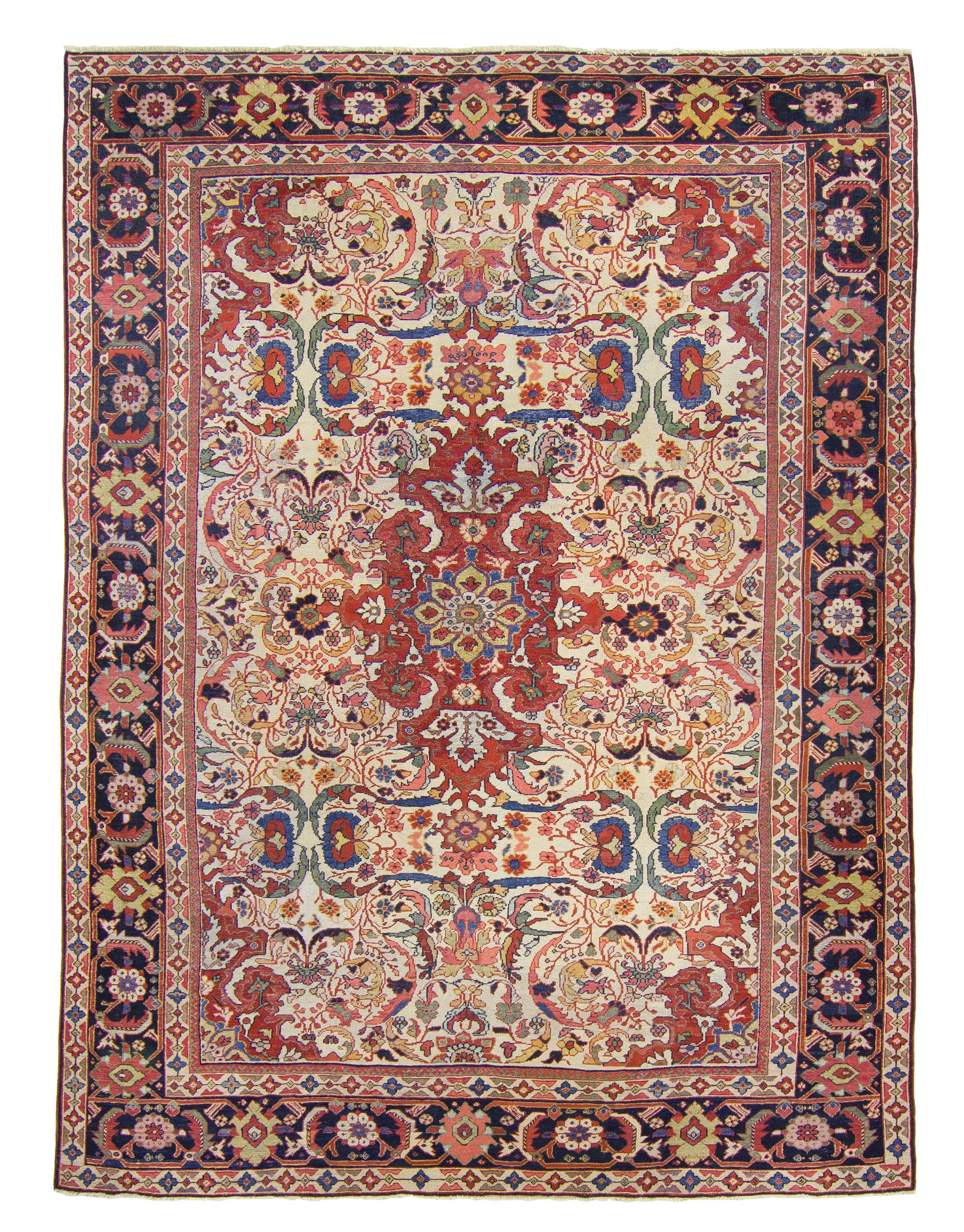 This intricate Mahal exhibits the trademarks of the style, with a fine floral sheen to showcase its Persian influence. The bird is the most reserved, yet even it expands on its floral designs and makes the background of black appear almost cheery. The field is the gem of this carpet, a scintillating flurry of color, vines, medallions, and petals. The long central medallion is the largest section of red unbroken in this carpet, containing peacock-like petals.