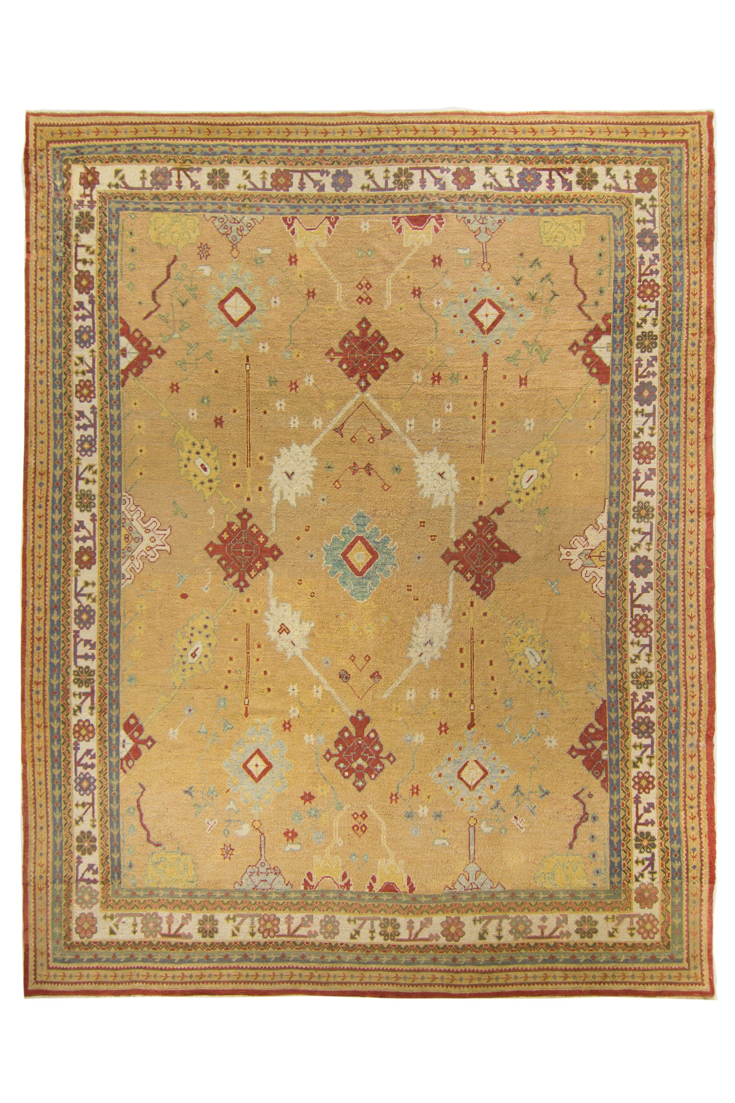 This large-scale Antique Oushak uses an allover pattern atop a rustic yellow field to fully utilize the space it has. The border is simple, with several colored rings surrounding the field and repeating basic flower patterns. But the field elaborates, surrounding blue medallions with red geometric knots. A fine addition to any collection.