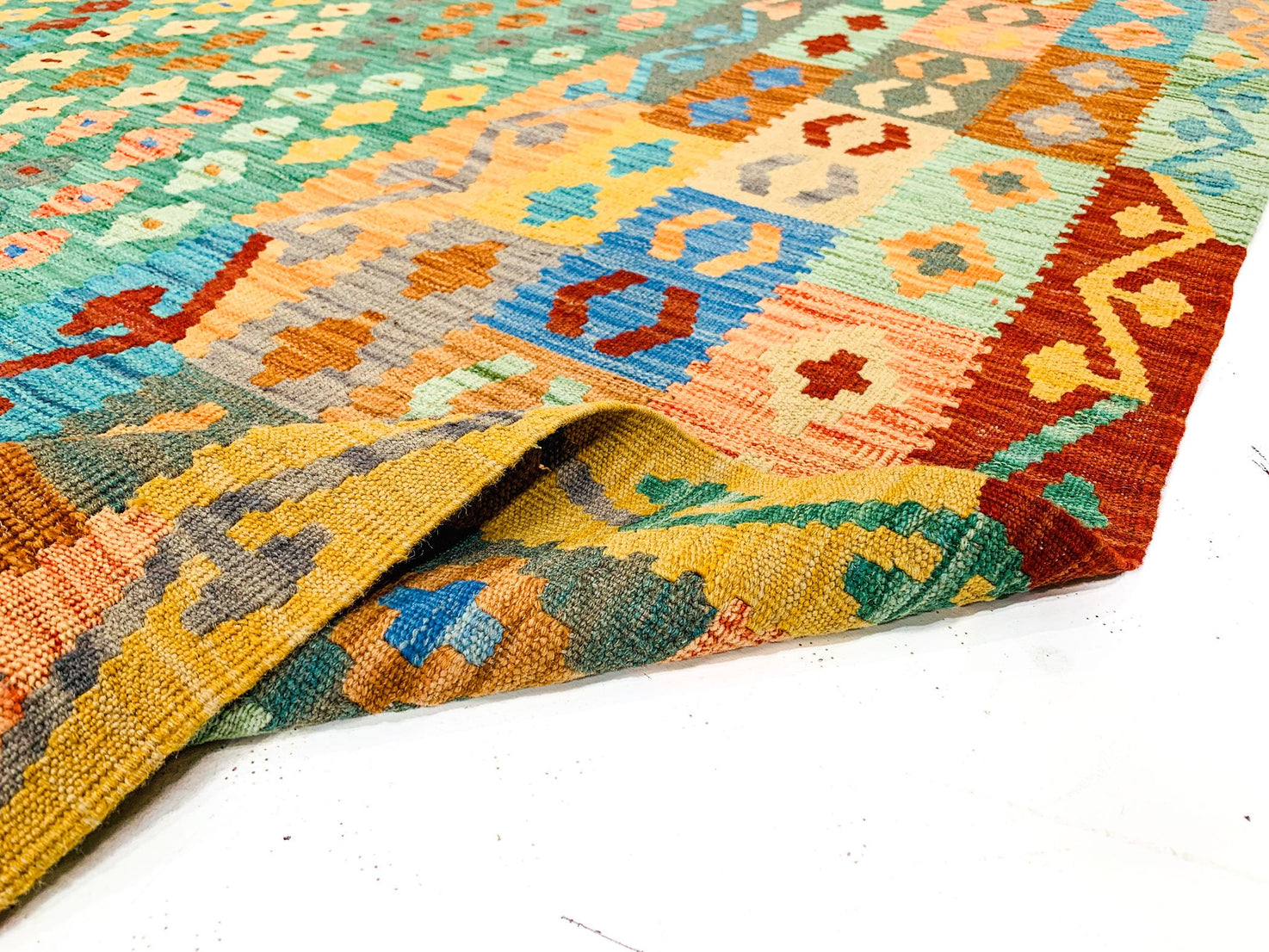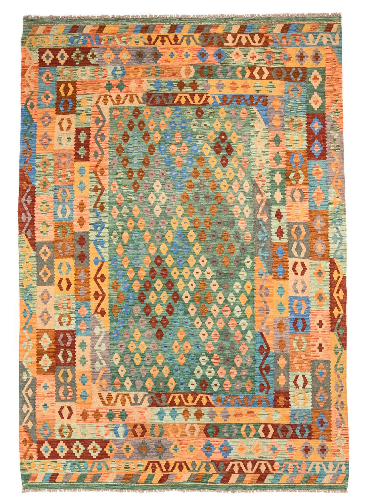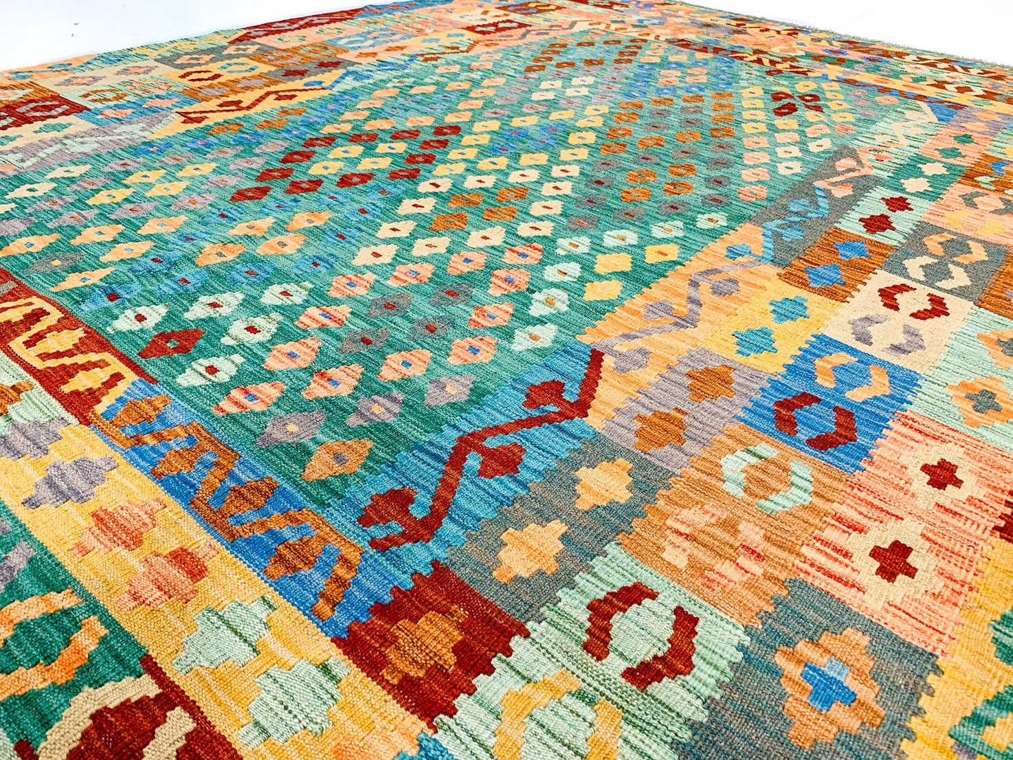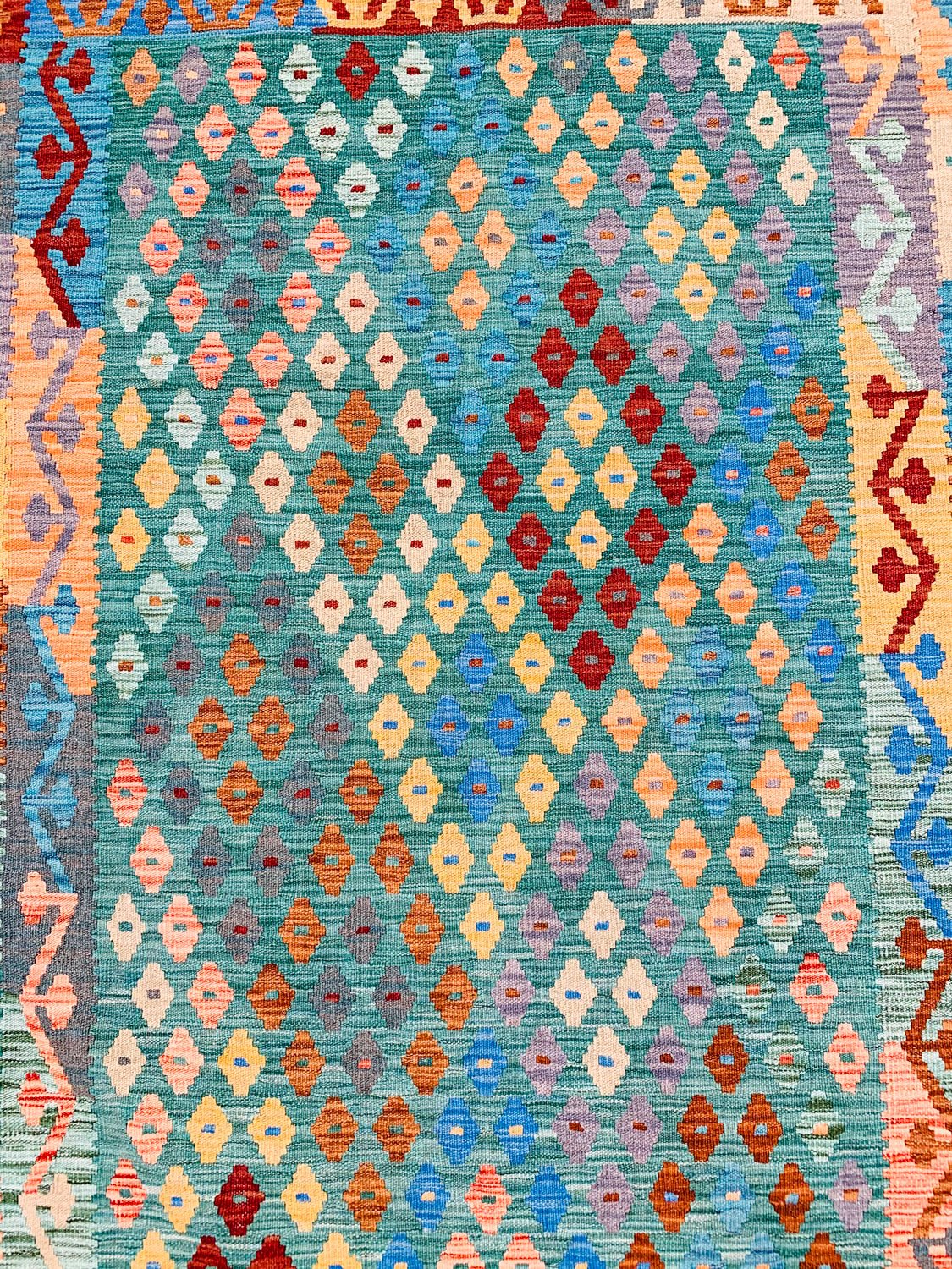This Miamana Kilim repeats the traditional allover diamond pattern that is common among Miamana carpets, atop a breathtaking sea-blue field. Vibrant, simple designs in the borders contain the same variation of color within the field, but the arrangement of the diamond pattern implies that the border is merely the cutting off point of an expanse that we cannot see. Great for entertainment rooms to draw the eye and make the room appear larger.