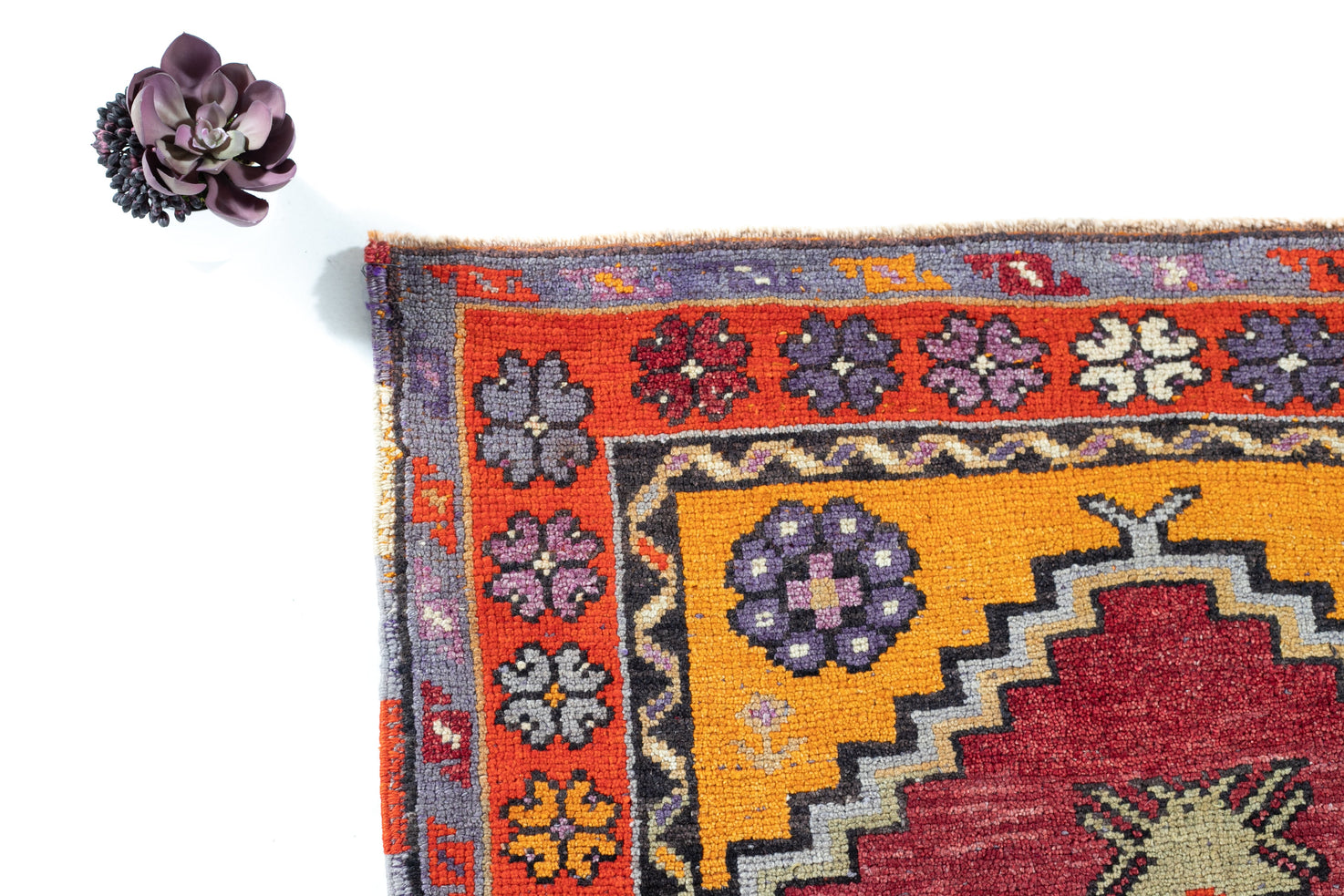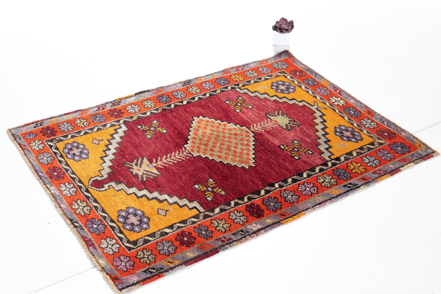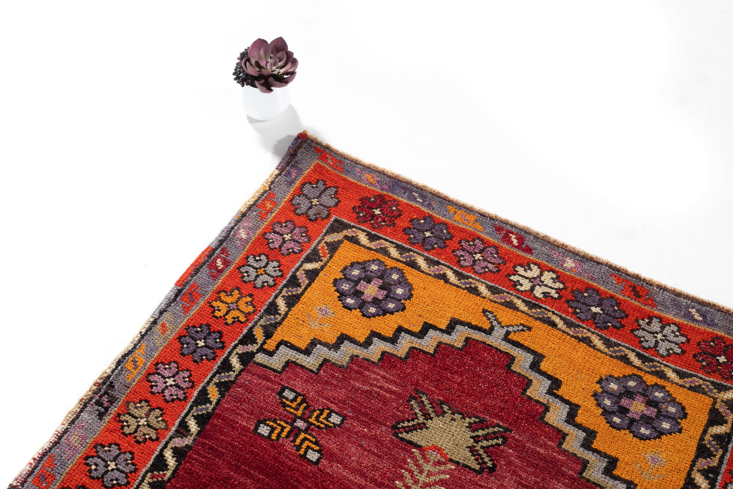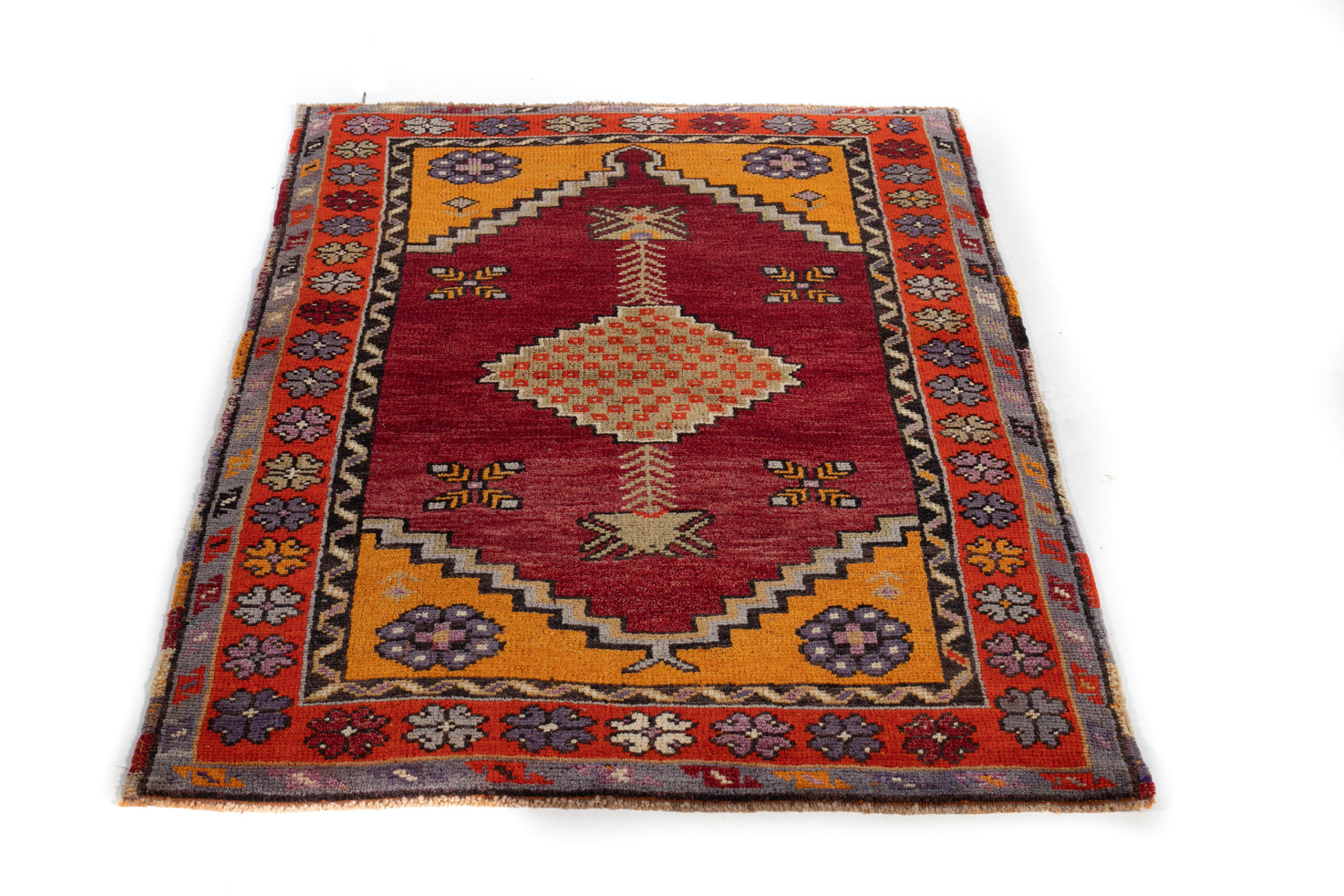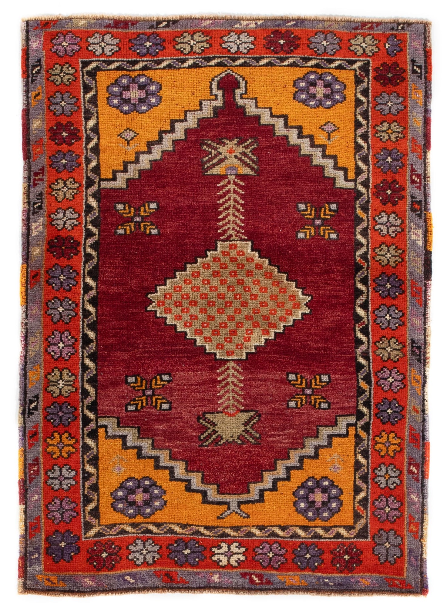 This beautiful Konya uses a deep red field and vivid oranges to paint a sunset in the corner-pieces. The medallion holds a checker pattern of red and orange within a diamond. The field upholds four crosses and uses a sinuous pattern in the first inner border. The total effect is repetitive and sunny, warm and full of vigor. Take this masterpiece home today!