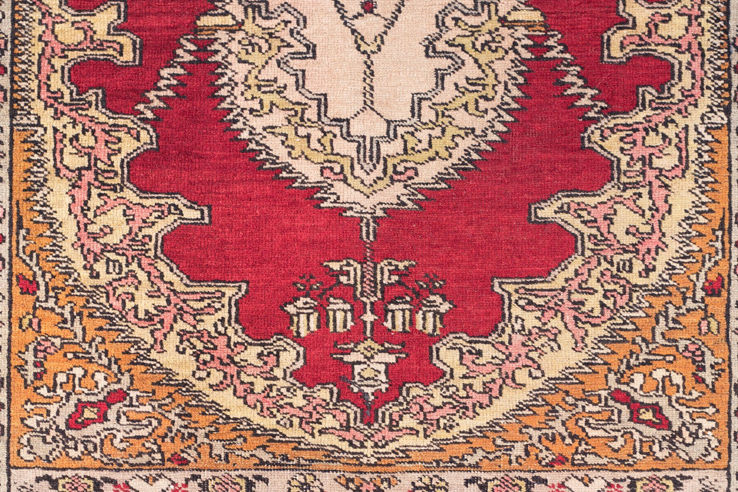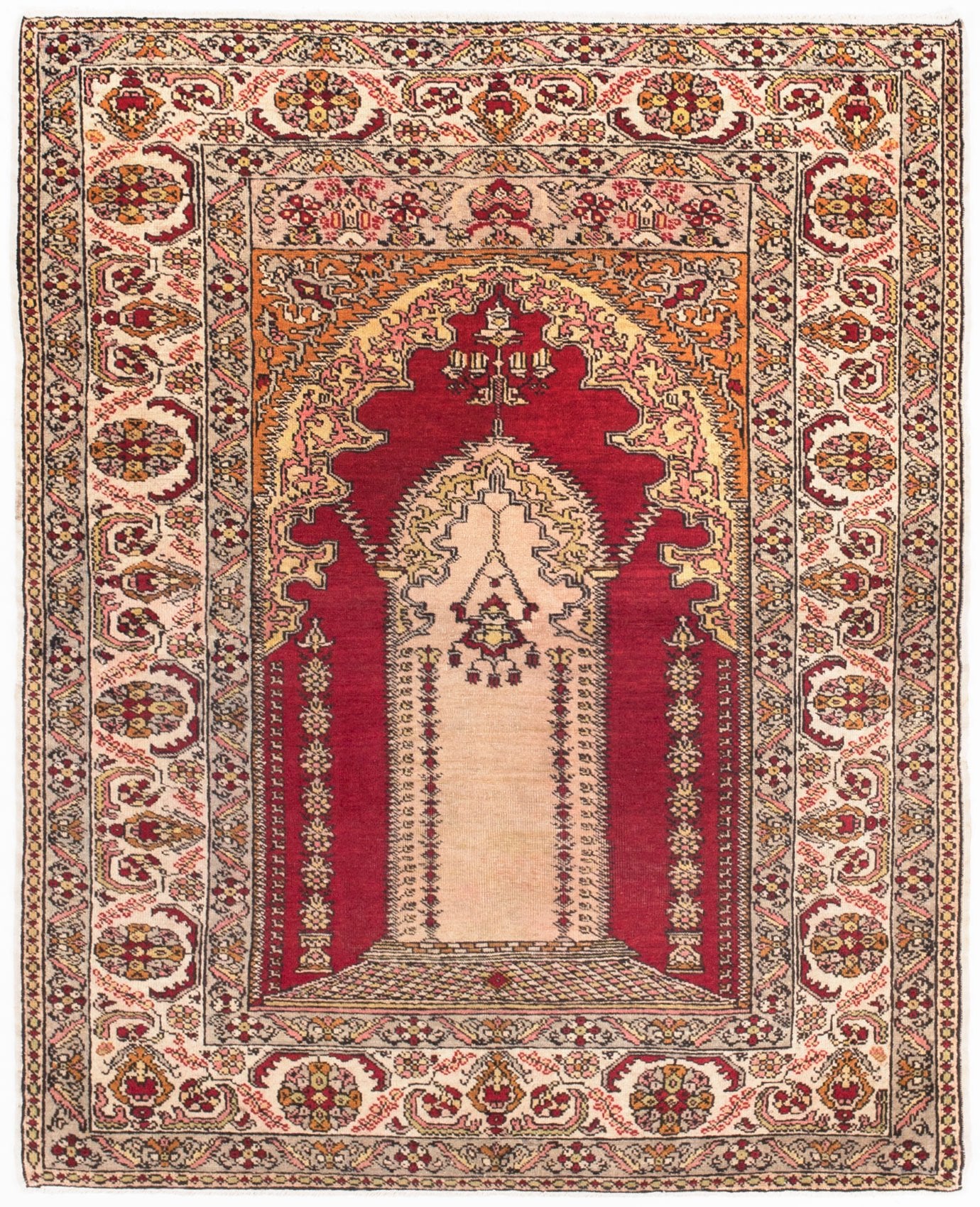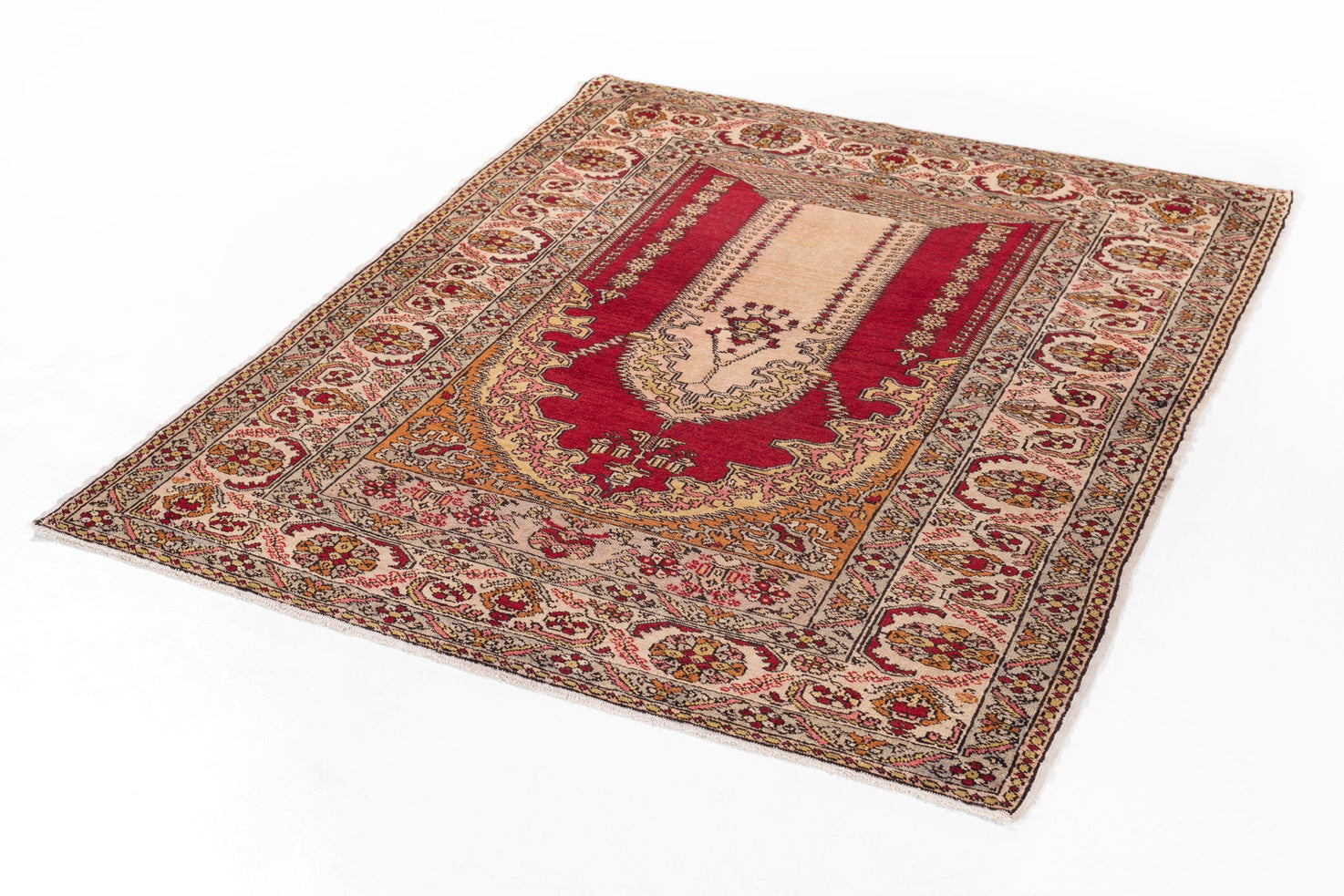 This beautiful cream and red prayer niche Kayseri focuses on two aspects: the delicate curve of the niche and the [red within gold within the cream floral scheme of the border. Kayseri carpets combine breath-taking dye work with intricate flourishes in corners and fields to drive home the majesty of artistic creation. Many prayer niche carpets use colorful corners to complement the somber niche’s purpose.